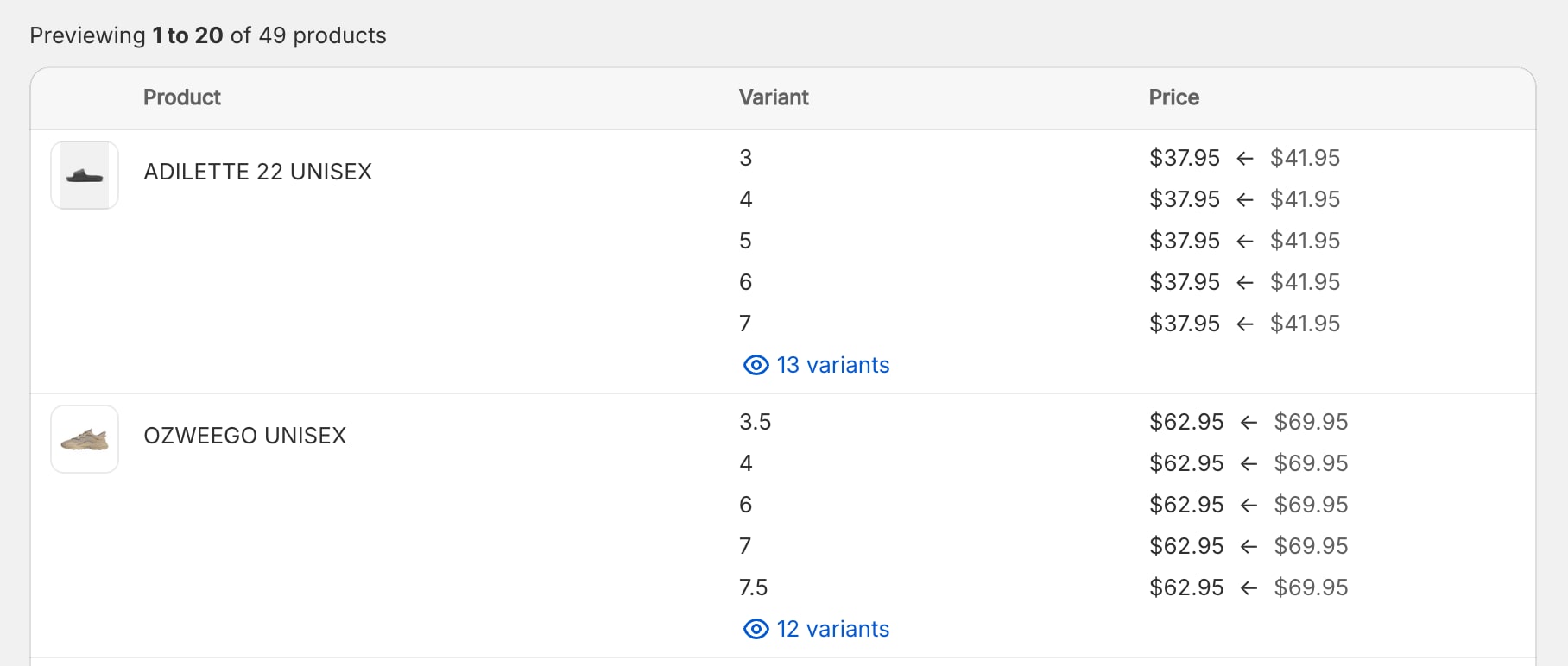 Previously we would display the old value of the price with a strikethrough but this could cause confusion because this is how the compare-at price is display on the storefront. The arrows should indicate the change in price value instead.