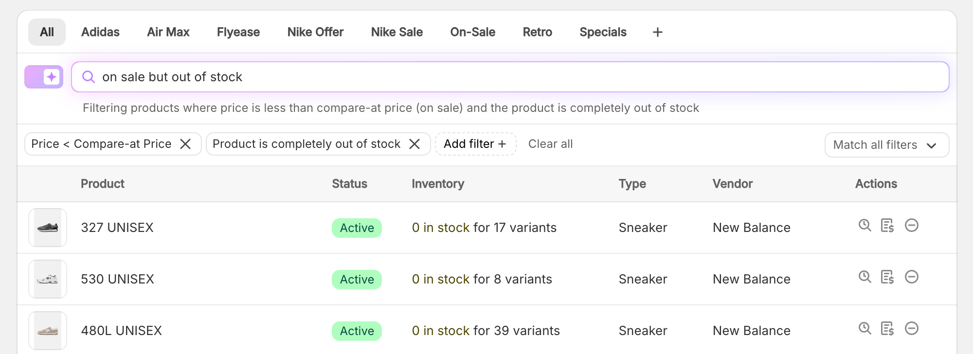 - “variants priced over $50 that are out of stock”